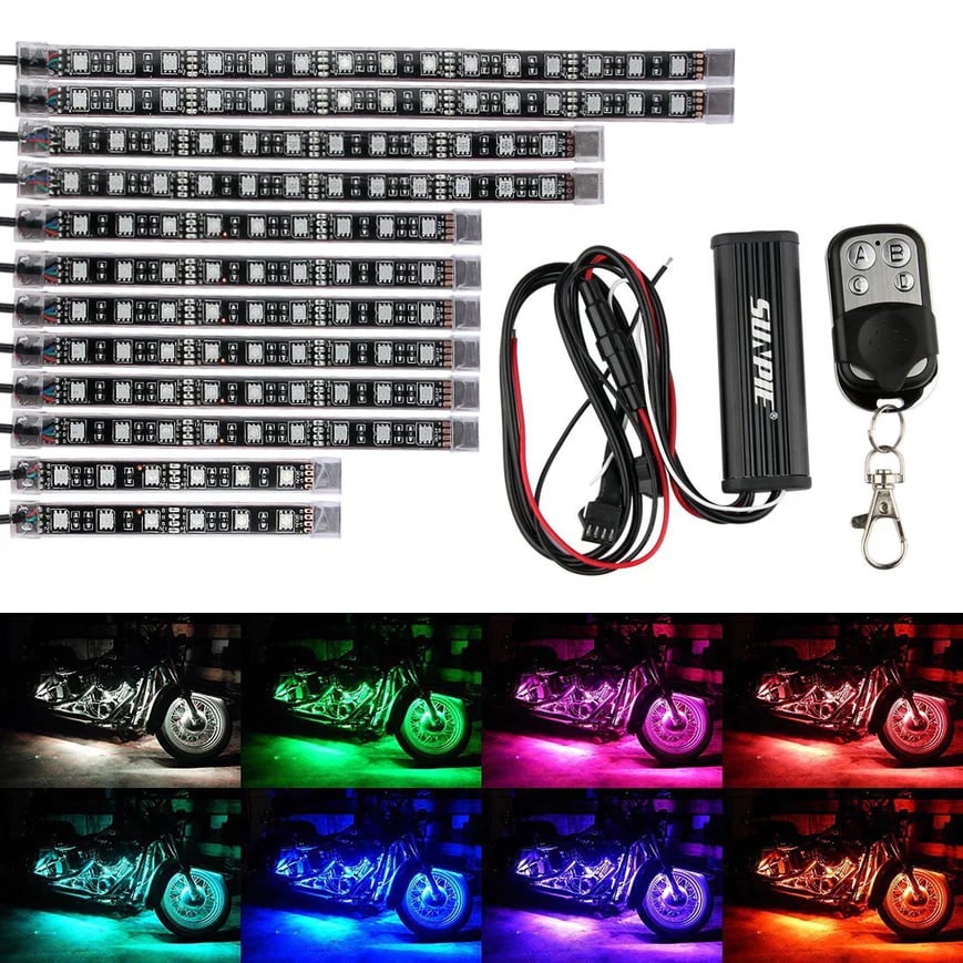 #SUNPIE 12Pcs Motorcycle LED Light Kit Strips Multi-Color Accent Glow Neon Ground Effect Atmosphere
